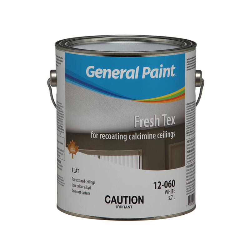 General Paint Fresh-Tex is a low-odour textured ceiling paint specifically formulated for textured ceilings and ceiling tiles. Fresh-Tex unique alkyd formulation will not dissolve ceiling texture and hide most stains in a single coat, but without the typical alkyd paint odour.
